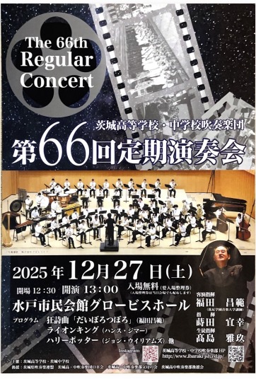 茨城高等学校・中学校吹奏楽団による、入場無料の音楽演奏会が12月27日(土)に水戸市民会館グロービスホールにて開催されます。実習生のみなさんは、是非ご参加ください。